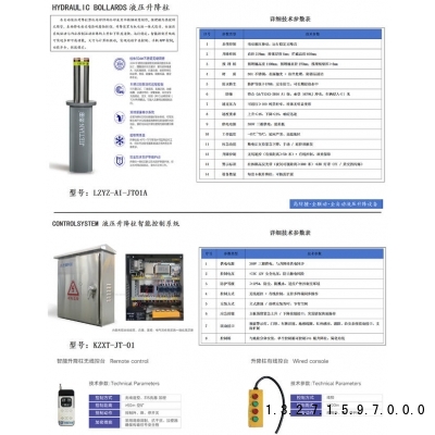 电动液压驱动,运行稳定无噪音系统控制升降柱体直径219mm;柱体厚度6mm;拦截高度600mm;预埋桶高度1100mm;预埋桶直径273mm;预埋桶壁厚>5mm预埋桶材 质304不锈钢,表面抛光+拉丝处理,防锈易清洁防水防尘防护等级≥IP68,完全防尘、可长期浸泡水中防撞符合GA/T1343-2016A1级,承受1679KJ冲击,车辆侵入≤1米通过压力可通行≥100吨货柜车,柱体无明显变形速度要求上升≤4S,下降≤2S,响应迅速供电电源380V三**供电,能耗低工作温度-45℃~75℃,适应严寒、高温地区应急功能断电后支持紧急下降,手动/遥控双触发无线遥控(有效距离≥50米)+有线控制,双重保障升降控制柱体贴高反光带(夜间可视距离≥300米)+LED灯带(红/黄交替闪烁)警示标识每套6根升降柱,可按需扩展设备数量